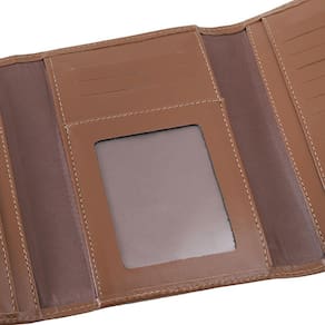 Parte interna: Dezessete slots para cartões que comportam até 34 unidades (considerando utilizar 2 cartões por slot). Cinco compartimentos livres para colocar cédulas e documentos, por exemplo. Compartimento revestido em PVC exclusivo para CNH.