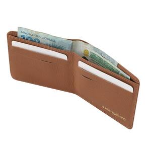 Estrutura do corpo: Construção em couro macio de espessura média e toque macio. Forro misto de poliéster e alumínio com blindagem de leitura Rfid. Logomarca prensada em relevo. Dimensões fechada: 10,5 x 8,5 x 01 cm largura x altura x espessura Dimensões aberta: 21,5 x 8,5 x 01 cm largura x altura x espessura Peso aproximado: 40 gramas Material: couro