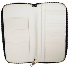 Carteira com 23 x 12 cm de dimensão espaçoso para colocar mais de 12 cartões, dinheiro e cheque. Use também para levar documentos e passaporte. Na cor preta com estampa do rosto da Minnie brilhante dourado e sua assinatura.