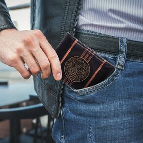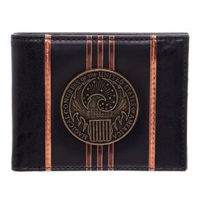 O que está dentro: três bolsos horizontais para cartão, dois bolsos verticais para cartão, uma janela transparente para identidade, um compartimento para moedas de tamanho completo, Congresso mágico dos Estados Unidos da América