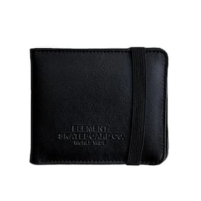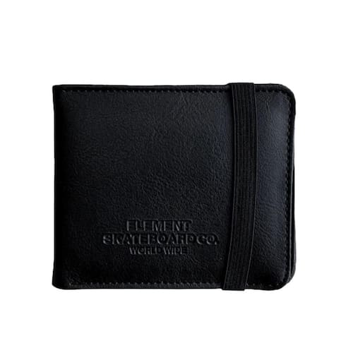 Carteira Element com repartições internas, fecho com elástico de ajuste, aplicações em laser e etiquetas personalizadas.