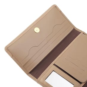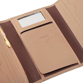 Parte interna: Quinze slots para cartões que comportam até 30 unidades (considerando utilizar 2 cartões por slot). Quatro compartimentos livres para colocar cédulas e folhas de cheques, por exemplo. Núcleo de PVC para acomodar RG e documentos similares.