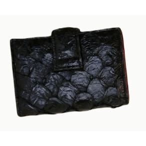 Carteira porta documentos, modelo Lucy, confeccionada em pele de pirarucu, forro 100% couro com duas divisórias, bolso interno com zíper, comporta 5 cartões, porta fotos e porta caneta. Dimensões: 16cm x 12cm x 2cm. Marca: Frank Nemeth