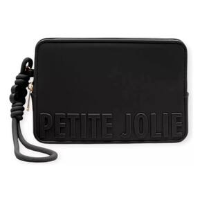 Carteira preta de tamanho pequeno. O modelo vem no shape retangular com fechamento superior em zíper esportivo. Possui logomania com o nome Petite Jolie em destaque na capa. Com alça de mão que imita atacador em J-Lastic.