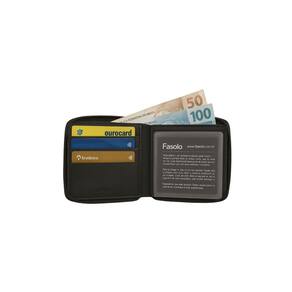Carteira Fasolo Masculina Couro - Confeccionada em Couro; - Possui seis divisões para cartão; - Possui seis plásticos transparentes para documentos; - Possui uma repartições para notas e divisões extras; - Possui Bolso com zíper externo para moedas. ; - Dimensões: 9 x 12 x 2 cm alt x larg x prof ; Imagens meramente ilustrativas