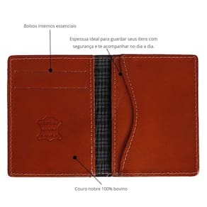 Especificações Técnicas: - Couro Nobre 100% Bovino; - 05 Bolsos internos; - Espaço para cartões de Créditos, Notas e CNH - Forro em Couro Nobre 100% Bovino - Cor Marrom - Compacta e Essencial