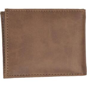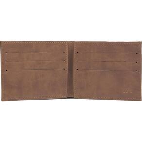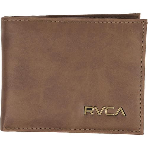 Carteira RVCA em material não natural com duas partes, seis compartimentos para cartão, compartimento para dinheiro e aplique metalizado RVCA na frente.