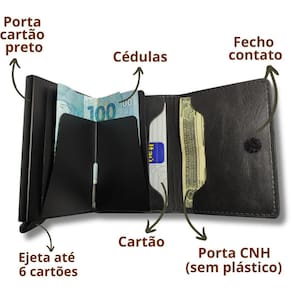 Além dos cartões, nossa carteira comporta sua CNH sem plástico de proteção e possui um porta-cédulas prático para suas notas.