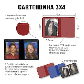 Descrição A clip fabrica as melhores carteirinhas do mercado, priorizando a qualidade e facilidade de uso. As carteirinhas da clip são feitos com as melhores materiais do mercado. Material laminado fosco 0,15mm com sarja fosca super transparente especialmente feita para a foto não grudar. Os dois materiais são soldados em alta frequência, garantindo a fixação perfeita. Materiais Laminado fosco 0,15mm Laminado pvc sarja transparente 0,13mm Cores Azul Preto Vermelho As cores sempre irão . Se quiser mudar a composição das cores, favor mandar mensagem imediatemente depois da compra pelo campo de mensagem História clip Alex desde pequeno tinha um grande interesse em guardar todos os retratos da sua família, principalmente, porque sem estas fotos não existiriam suas histórias . Desta maneira nasceu a empresa clip e junto com ela todos os seus álbuns, porta retratos e produtos para guardar as melhores lembranças de sua vida................ Marca: Não Informado