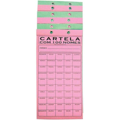 Cartela De Rifa Com 100 Nomes Pacote Com 50 Cartelas Tamoio Rifa de nomes foi criada para jogos, sorteio de prêmios, rifas, entre outras funcionalidades. O nome fica grampeado de maneira que não é possível ver com nenhum tipo de objeto ou luz. Detalhes: - com 100 nomes - embalagem com 50 cartelas Dimensões da cartela:20.5 x 10.5 x 0.01 a x l x p Cores: rosa, verde, branco e azul. Cores enviadas de forma , sem opção de escolha. Marca: Não Informado Ean: 7897571990105