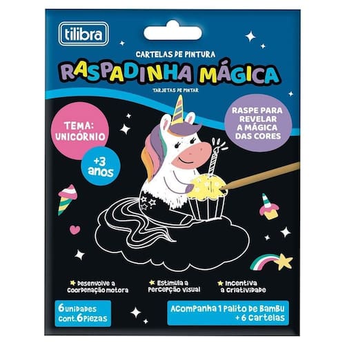 A raspadinha mágica oferece uma maneira curiosa e divertida de pintar, incentivando a coordenação motora, a percepção visual e a criatividade. Este produto, com temática de unicórnio, é indicado para crianças a partir de 3 anos. São 6 cartelas pretas, no formato 148x210mm, que ao serem raspadas com o palito de bambu incluso, revelam cores vibrantes. Produto certificado inmetro brinquedos/segurança - atenção: imagem meramente ilustrativa. Pode ocorrer mudanças no tom da cor para o produto real ou mudanças na embalagem sem aviso prévio por parte do fornecedor/fabricante. Homologação Inmetro: CE-BRI/IQB 005608 54346/21-022 Marca: Não Informado Ean: 7891027352103