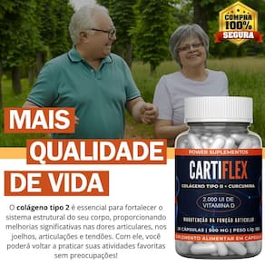 Cartiflex - 30 cápsulas Sabor: neutro Este anuncio contém 1 cartiflex colágeno tipo ii concentrado com 30 cápsulas para uso diário. Este suplemento alimentar é uma poderosa fórmula composta por colágeno tipo 2 não desnaturado, projetado para adultos acima de 19 anos que buscam melhorar sua saúde geral. O colágeno tipo 2 desempenha um papel crucial no fortalecimento do sistema imunológico, especialmente na prevenção e controle de situações que afetam as articulações, cartilagens, tendões e ligamentos. Sua ação promove a saúde articular, mas também auxilia as articulações e juntas que estão associadas a essas condições, proporcionando uma maior qualidade de vida para idosos, obesos, pacientes lesionados e entusiastas do exercício físico. Além disso, o colágeno é essencial para a vitalidade do cabelo, pele e unhas, ajudando a manter sua integridade e elasticidade ao longo do tempo. Ao tomar cartiflex colágeno tipo 2 regularmente, você estará fortalecendo suas articulações, prevenindo o desgaste, mantendo a integridade dos músculos e protegendo ligamentos e tendões. Cada dose deste suplemento fornece 40mg de colágeno tipo ii, contribuindo significativamente para a sua saúde e bem-estar. Estamos aqui para esclarecer qualquer dúvida que você possa ter. Sinta-se à vontade para entrar em contato conosco através do campo de perguntas. Aguardamos o seu pedido do vendedor: 07 dias. Este produto é isento de registro conforme rdc 240/2018. Lembre-se, este produto é um suplemento dietético, não é um . Suplementa ante dietas insuficientes. Consulte seu médico e / ou farmacêutico. Aviso legal Idade mínima recomendada: 19 anos. Consumir junto com alimentos para facilitar sua assimilação. Este produto é um suplemento dietético, não um . Suplementa dietas insuficientes. Consulte o seu médico e/ou farmacêutico. Este anuncio contém 1 cartiflex colágeno tipo ii concentrado com 30 cápsulas para uso diário. Este suplemento alimentar é uma poderosa fórmula composta por colágeno tipo 2 não desnaturado, projetado para adultos acima de 19 anos que buscam melhorar sua saúde geral. O colágeno tipo 2 desempenha um papel crucial no fortalecimento do sistema imunológico, especialmente na prevenção e controle de situações que afetam as articulações, cartilagens, tendões e ligamentos. Sua ação promove a saúde articular, mas também auxilia as articulações e juntas que estão associadas a essas condições, proporcionando uma maior qualidade de vida para idosos, obesos, pacientes lesionados e entusiastas do exercício físico. Além disso, o colágeno é essencial para a vitalidade do cabelo, pele e unhas, ajudando a manter sua integridade e elasticidade ao longo do tempo. Ao tomar cartiflex colágeno tipo 2 regularmente, você estará fortalecendo suas articulações, prevenindo o desgaste, mantendo a integridade dos músculos e protegendo ligamentos e tendões. Cada dose deste suplemento fornece 40mg de colágeno tipo ii, contribuindo significativamente para a sua saúde e bem-estar. Estamos aqui para esclarecer qualquer dúvida que você possa ter. Sinta-se à vontade para entrar em contato conosco através do campo de perguntas. Aguardamos o seu pedido do vendedor: 07 dias. Este produto é isento de registro conforme rdc 240/2018. Lembre-se, este produto é um suplemento dietético, não é um . Suplementa ante dietas insuficientes. Consulte seu médico e / ou farmacêutico. Aviso legal Idade mínima recomendada: 19 anos. Consumir junto com alimentos para facilitar sua assimilação. Este produto é um suplemento dietético, não um . Suplementa dietas insuficientes. Consulte o seu médico e/ou farmacêutico.