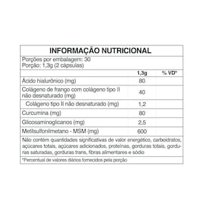 Ingredientes: metilsulfonilmetano msm , membrana de casca de ovo, extrato de rizomas de curcuma longa, hialuronato de sódio obtido pela fermentação de streptococcus zooepidemicus, colágeno de frango com colágeno tipo ii não desnaturado e antiumectantes carbonato de cálcio e dióxido de silício. Composição da cápsula: gelatina.