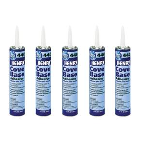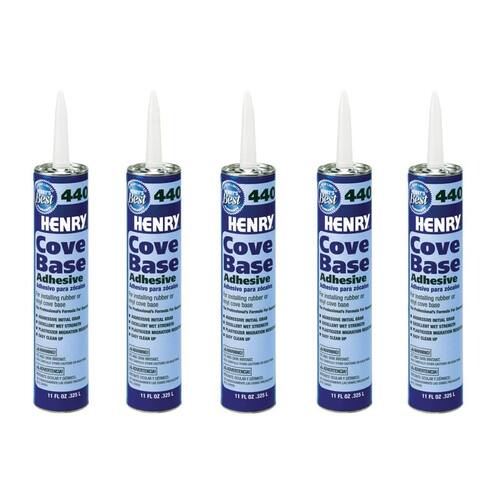 Adesivo básico Henry Cove, 11 onças. Pacote com 5, a embalagem pode variar. Henry H440. Para base de parede residencial ou comercial de borracha e vinil. Adere a: concreto, bloco de concreto, drywall de gesso, gesso, madeira, madeira compensada, tijolo e laminado de plástico. Congele e descongele de forma estável a 10 graus. F. (-12 graus C). Evite baixas temperaturas ou vários ciclos de congelamento e descongelamento. Contexto de VOC: 0 g/L; calculado e relatado, SCAQMD 1168. Cobertura: base de parede de 4", aproximadamente 27 pés lineares por cartucho de 11 onças. Garantia limitada de 10 anos.