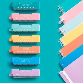 Em seguida, introduza o papel ou material que deseja perfurar, ajustando o guia de alinhamento para garantir a precisão. Após isso, pressione a alavanca para perfurar o material. Por último, posicione a espiral nos furos perfurados e feche-a utilizando a função de encadernação da encadernadora Multi Cinch We R Memory Keepers.