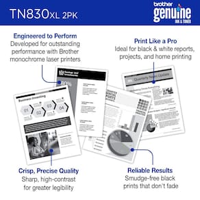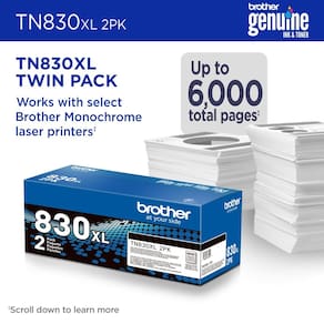 - Imprima com confiança e imprima mais com os cartuchos de toner pretos genuínos TN830XL 2PK da Brother de alto rendimento, a escolha conveniente para impressão eficiente e de alto volume em impressoras Brother monocromáticas a laser (preto e branco)