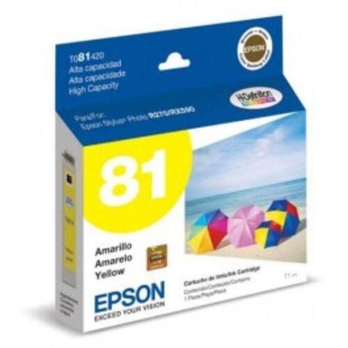 Cartucho Epson 81 T081420 Amarelo de Alta Capacidade Hi-Definition, indicado para Stylus Photo R270 / R290 / T50 / TX720WD / SP1410 utiliza a tecnologia exclusiva Epson com Tinta DURABrite Ultra resistente à água, borrões e descoloração.