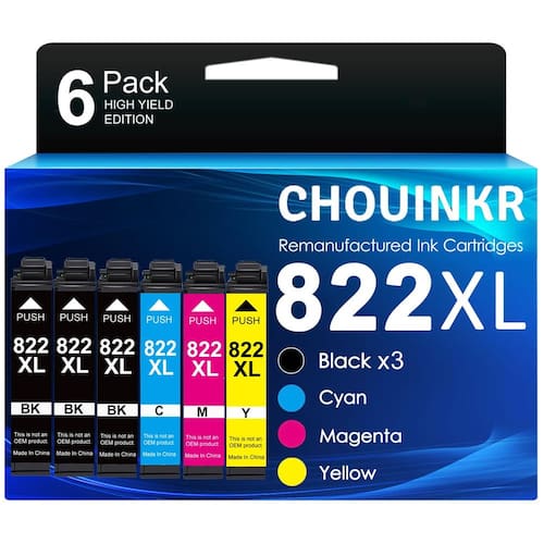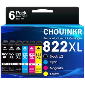não822xl - Conteúdo da embalagem: cartuchos de tinta de substituição CHOUINKR 822XL 822 XL T822XL pacote combo de cartuchos de tinta - Impressoras compatíveis: Funciona com impressora WF-3820 WF-4820 WF-4830 WF-4834 WF-4833 WF-3823 - Rendimento de página alto: 1100 páginas por cartucho de tinta preta 822XL / 1100 páginas por cartucho de tinta colorida 822XL com cobertura de 5% - Conteúdo da embalagem: 3 x 822XL preto, 1 x 822XL ciano, 1 x magenta 822XL, 1 x 822XL amarelo, 1 x manual do usuário (sem cartuchos Autêntico) - Observação: Este não é um pacote combo de cartuchos de tinta 822xl preto e colorido Autêntico
