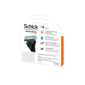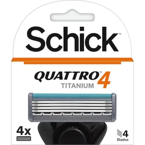 - Os refis de cartuchos de titânio da Schick Quattro contêm 4 lâminas com novo sistema de revestimento de lâmina de titânio.