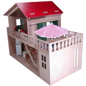 Linda casinha de boneca com 2 andares, piscina, 2 terraços, sala de estar, cozinha e quarto espaçoso, tudo com mobília. Possui também duas portas corrediças e uma escada interna que da acesso ao andar superior.