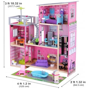 Quintal com piscina e churrasqueira para brincadeiras prolongadas Elevador desliza para todos os 3 andares Serve para todas as bonecas de moda de até Feito de madeira para um jogo duradouro Acessórios de luzes e sons para histórias interativas realistas Marca: Não Informado