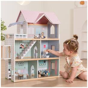 Esta casa de boneca é um conjunto de casa multistória de madeira, mobiliado e com um elevador funcional. Com 5 quartos, varanda e medindo 0,79 metros de altura por 0,61 metros de largura, esta casa é perfeita para bonecas de família com cerca de 12 centímetros de altura. Além disso, a casa pode acomodar móveis com cerca de 18 centímetros de altura da Barbie, HAPE, Calico Critters e Gabby.