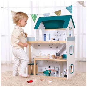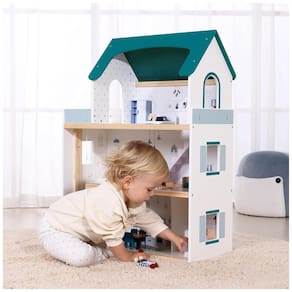 CASA DE BONECAS DE MADEIRA Com 3 andares e 5 quartos, esta casa de bonecas de madeira é perfeita para acomodar bonecos de até 46 polegadas. Cada quarto vem equipado com um conjunto de móveis realistas e o papel de parede listrado e esquema de cores brilhantes dão à casa um estilo moderno. Através do cosplay de casa de bonecas, as crianças podem desenvolver um senso de família.