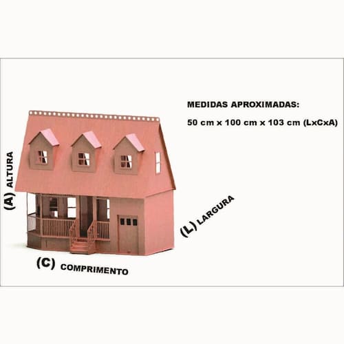 Confeccionada em mdf de 3 mm,a casinha de bonecas é composta por diversas peças,as quais se encaixam sutilmente devido a precisão de corte dos mesmos. Não acompanha móveis.