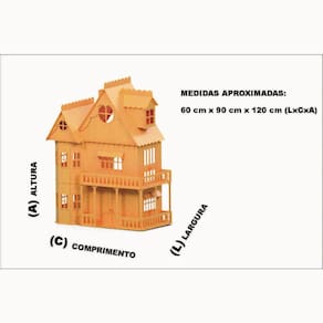 Confeccionada em mdf de 3 mm,a casinha de bonecas é composta por diversas peças,as quais se encaixam sutilmente devido a precisão de corte dos mesmos. Não acompanha móveis.