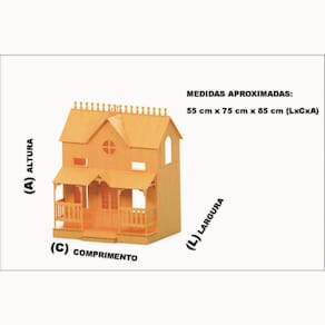 Confeccionada em mdf de 3 mm,a casinha de bonecas é composta por diversas peças,as quais se encaixam sutilmente devido a precisão de corte dos mesmos. Não acompanha móveis.