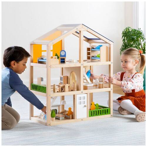 Projetada para crianças a partir de 3 anos, a casa possui três andares que permitem múltiplas áreas para brincadeiras simultâneas, estimulando jogos de faz de conta. Inclui portas, janelas e uma escada removível que ampliam as possibilidades de interação e dramatização.