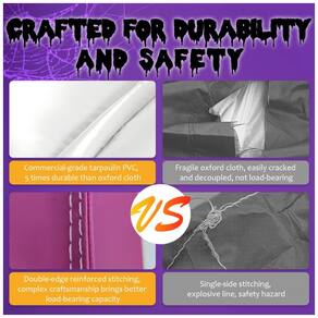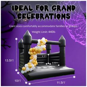 Com dimensões de 4,11m de comprimento, 3,50m de largura e 3,05m de altura, esta grande casa de saltos oferece uma área de salto espaçosa para crianças e adultos. Capacidade máxima de 6 jogadores e peso máximo de 204kg. Durabilidade é essencial em nossos produtos. A casa de saltos comercial é feita de material PVC durável de 0,45mm, certificado pela CE e ASTM, garantindo uma forte capacidade de peso. Com costuras de 45 pontos por polegada, garantimos alta qualidade e resistência. O potente soprador, certificado pela UL e ETL, infla completamente o brinquedo em apenas 1 minuto, com 2 grandes portas de ventilação com zíper para desinflar facilmente. 7 ganchos D na parte superior facilitam a instalação de balões e flores. O pacote inclui 100 balões decorativos. Reforçamos a embalagem em duas camadas e realizamos teste de pressão de ar por 24 horas para garantir a integridade do produto durante o transporte. Consulte o manual de instruções para montagem, armazenamento, manutenção e cuidados.