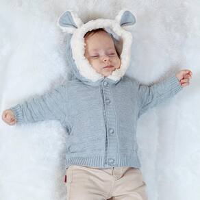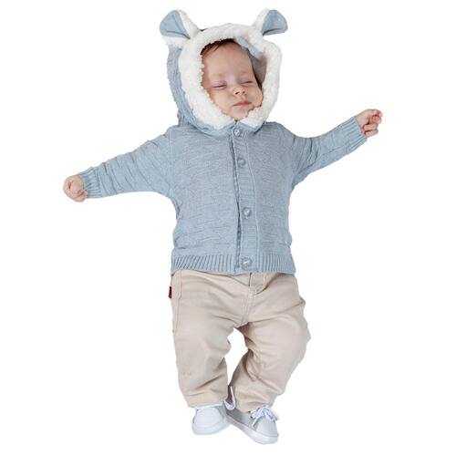 Cardigan de bebê trabalhado com capuz, pelo e orelhinha. Que oferece conforto para o dia todo.