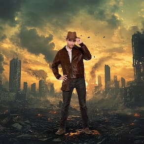 - Casaco marrom desgastado, bolsos frontais com fecho de aba