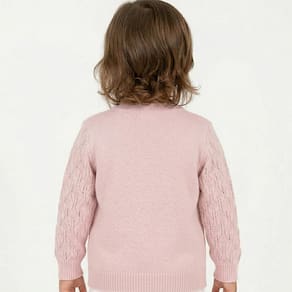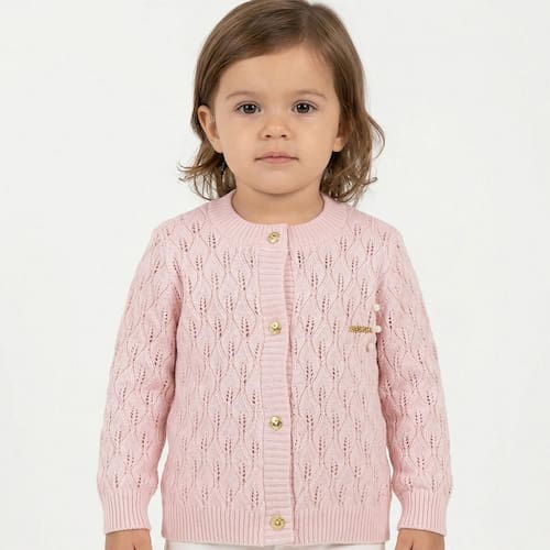 Casaco Folhas Tricô Kids feito em tecido algodão e acrílico, gola redonda, Tricô Kids em dourado no peito, fechamento em botões, manga longa e etiquetas personalizadas.