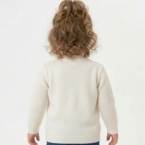 Casaco Gola Bordada Pérolas Tricô Kids feito em tecido algodão e acrílico, gola redonda, Tricô Kids em dourado no peito, fechamento em botões, manga longa e etiquetas personalizadas.