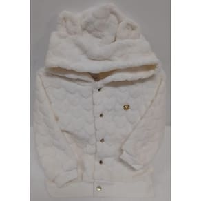 Características do Produto: - Jaqueta / Casaco super macia, quente e confortável. Todo em pelo trabalhado em forma de corações, que vai manter sua pequena super protegida do frio e no maior estilo. Detalhe de plaquinha personalizada da marca aplicada na frente. Possui punhos e barra ribanados. Capuz com orelhinhas em alto relevo, que dão um charme todo especial a peça. Abertura frontal por botões de pressão personalizados da marca. Simplesmente um encanto.