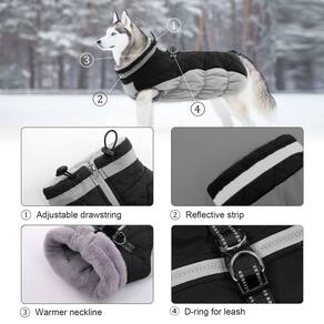 - Casaco de cachorro grande com gola rolê de pelúcia: a coleira de pele grossa e macia é macia ao toque. A coleira de gola alta pode proteger o pescoço do cão no clima frio. Há um cordão elástico na gola que pode ajustar o aperto e evitar vento e neve