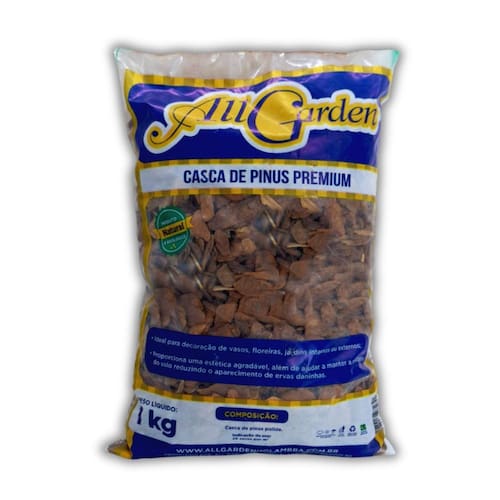 Descrição * Dê um acabamento profissional e natural aos seus vasos e jardins com a Casca de Pinus Premium All Garden. * Este pacote de 1kg é perfeito para decorar, proteger o solo, manter a umidade e reduzir o crescimento de ervas daninhas. * A escolha ideal para plantas mais saudáveis e um paisagismo impecável.
