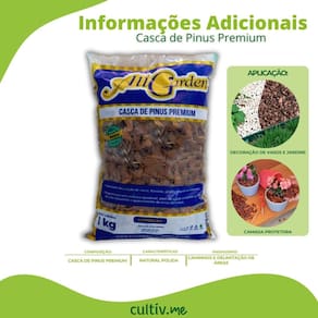 Características * Produto: Casca de Pinus Premium * Marca: All Garden * Peso Líquido: 1 kg * Composição: Casca de pinus natural polida. * Origem: Produto 100% natural e ecológico.