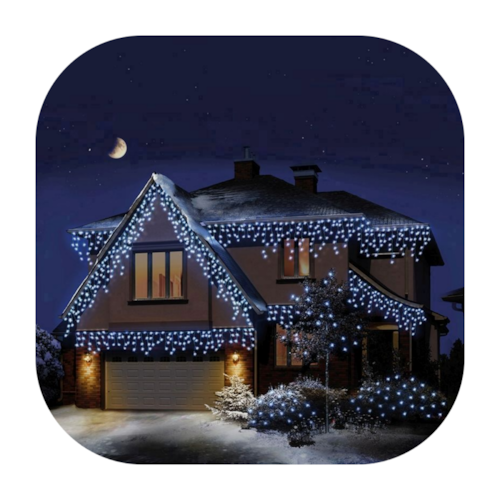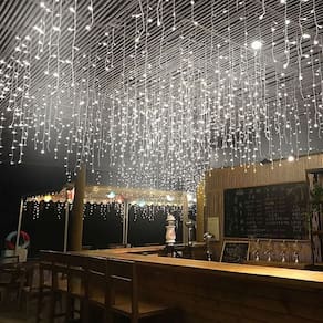 Linda Cascata Led à prova d’água, com 120 Leds. Possui 8 funções (7 funções de pisca pisca e 1 fixa) medindo 3 metros de largura e com fio branco.