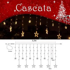 Ilumine o seu Natal com a mágica da nossa cascata de estrela Com 2,5 metros de largura e 80 cm de altura, essa peça decorativa transforma qualquer ambiente em um espetáculo de luz. Cada uma das estrelas nas pontas brilha com intensidade, trazendo um toque de encanto com seus 138 LEDs, perfeitos para criar uma atmosfera acolhedora e festiva.