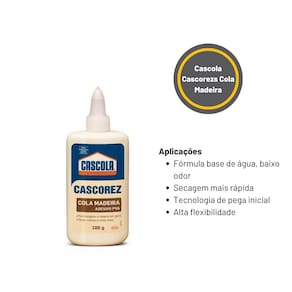 Cascola Cascorez Cola Madeira é um adesivo à base de PVA, desenvolvido para reparos e consertos de móveis e objetos em madeira, laminados plásticos, aglomerados, MDF e HDF. Deve ser utilizado pelos processos convencionados de colagem (prensagem a frio e quente). Cascola Cascorez Cola Madeira se diferencia dos outros adesivos vinílicos, já que adere ainda úmido.