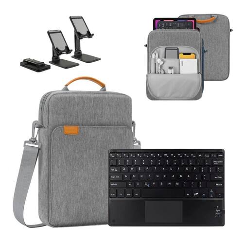 Case bag alça + teclado + suporte para samsung s10 fe+ 13.1 Cor: cinza O kit 3 em 1 reúne os acessórios ideais para transformar seu tablet ou em uma verdadeira estação de trabalho portátil. Composto por uma case bag transversal, um teclado com touchpad e um suporte universal ajustável, o conjunto é perfeito para quem busca conforto, produtividade e mobilidade no dia a dia. Compatível com tablets e ipads de até 13 polegadas, o kit é ideal para home office, estudos, viagens ou trabalho em movimento. A bolsa possui design moderno e material resistente à água, oferecendo segurança ao transportar seus dispositivos. O teclado bluetooth proporciona digitação fluida e touchpad integrado, enquanto o suporte dobrável garante o ângulo perfeito e uma postura ergonômica durante o uso. Perfeito para quem quer unir estilo, funcionalidade e desempenho em um único kit compacto ------------------ ------------------ O teclado é compatível com qualquer tablet R: sim, o teclado é compatível com tablets e ipads de até 13 polegadas que possuam conexão bluetooth. O teclado tem touchpad integrado R: sim, o teclado possui um touchpad sensível e preciso, permitindo controle total sem precisar de mouse. O suporte é ajustável R: sim, o suporte universal é dobrável e permite ajustar o ângulo de visualização conforme sua necessidade. A bolsa é impermeável R: a case bag possui material resistente à água, ideal para proteger seus equipamentos durante o transporte. A bolsa é impermeável R: a case bag possui material resistente à água, ideal para proteger seus equipamentos durante o transporte. O teclado precisa de pilhas R: não. Ele é recarregável por cabo usb incluso. ------------------ Especificações ------------------ Tipo de conexão: bluetooth Teclado: recarregável via usb Tamanho do teclado: 24cm x 15cm. Tamanho da case bag: 35.5cm x 28cm Compatibilidade: tablets e ipads de até 13 polegadas ------------------ Conteúdo ------------------ 1x case bag transversal 13 1x teclado com touchpad 1x suporte universal ajustável Anúncio referente a kit para tablets e Acessórios e aparelhos que ambientam as fotos não inclusos. ------------------ Apresentação: ------------------ - qualidade garantida. - atendimento qualificado. - enviamos para todo o brasil. - compra garantida. - despachamos em até 1 dia útil após confirmação do pagamento Garantimos a devolução por arrependimento em até 7 dias, após o recebimento e de 15 dias contra defeitos de fabricação. Marca: Não Informado Ean: 7793596887638