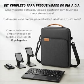 Case bag + teclado touchpad+ suporte para lenovo p12 tb371fc Cor: azul marinho O kit 3 em 1 reúne os acessórios ideais para transformar seu tablet ou em uma verdadeira estação de trabalho portátil. Composto por uma case bag transversal, um teclado com touchpad e um suporte universal ajustável, o conjunto é perfeito para quem busca conforto, produtividade e mobilidade no dia a dia. Compatível com tablets e ipads de até 13 polegadas, o kit é ideal para home office, estudos, viagens ou trabalho em movimento. A bolsa possui design moderno e material resistente à água, oferecendo segurança ao transportar seus dispositivos. O teclado bluetooth proporciona digitação fluida e touchpad integrado, enquanto o suporte dobrável garante o ângulo perfeito e uma postura ergonômica durante o uso. Perfeito para quem quer unir estilo, funcionalidade e desempenho em um único kit compacto ------------------ ------------------ O teclado é compatível com qualquer tablet R: sim, o teclado é compatível com tablets e ipads de até 13 polegadas que possuam conexão bluetooth. O teclado tem touchpad integrado R: sim, o teclado possui um touchpad sensível e preciso, permitindo controle total sem precisar de mouse. O suporte é ajustável R: sim, o suporte universal é dobrável e permite ajustar o ângulo de visualização conforme sua necessidade. A bolsa é impermeável R: a case bag possui material resistente à água, ideal para proteger seus equipamentos durante o transporte. A bolsa é impermeável R: a case bag possui material resistente à água, ideal para proteger seus equipamentos durante o transporte. O teclado precisa de pilhas R: não. Ele é recarregável por cabo usb incluso. ------------------ Especificações ------------------ Tipo de conexão: bluetooth Teclado: recarregável via usb Tamanho do teclado: 24cm x 15cm. Tamanho da case bag: 35.5cm x 28cm Compatibilidade: tablets e ipads de até 13 polegadas ------------------ Conteúdo ------------------ 1x case bag transversal 13 1x teclado com touchpad 1x suporte universal ajustável Anúncio referente a kit para tablets e Acessórios e aparelhos que ambientam as fotos não inclusos. ------------------ Apresentação: ------------------ - qualidade garantida. - atendimento qualificado. - enviamos para todo o brasil. - compra garantida. - despachamos em até 1 dia útil após confirmação do pagamento Garantimos a devolução por arrependimento em até 7 dias, após o recebimento e de 15 dias contra defeitos de fabricação. Marca: Não Informado