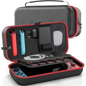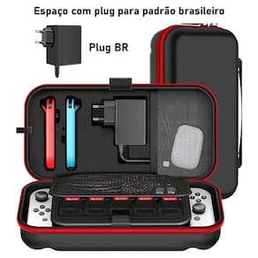 Case Bolsa Nintendo Switch Oled Espaço Carregador Plug BR Fantástico case para guardar e tranportador o Nintendo Switch OLED ou versão padrão V1/V2. Além de possuir compartimento próprio para o console, também possui local próprio para o carregador e os joypads. Possui ainda espaço para 20 cartuchos de jogos e espaço para outros objetos, como cabos, fones, etc. Conta ainda com zipper duplo e macio. Possui alça de mão confortável e anti-deslizante.