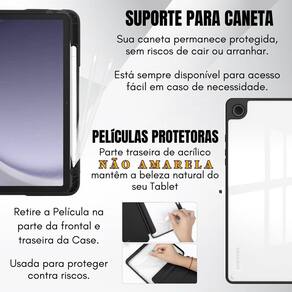Case + caneta + película para tab samsung a9+ 11 x216 x210 Cores: azul claro essa capa incrível oferece uma variedade de funcionalidades inteligentes para garantir a segurança do seu tablet. Com sua estrutura de acrílico resistente e durável, ela é especialmente projetada para proteger seu dispositivo contra quedas acidentais, mantendo-o seguro em qualquer Situação. além da proteção robusta, a parte interna da capa é revestida com microfibra suave, cuidadosamente selecionada para criar uma barreira protetora, mantendo a tela do seu tablet livre de riscos e quedas e sua parte traseira também. Deixando seu tablet lindo e protegido ao mesmo tempo, e sem preocupação. Assim, você pode desfrutar de uma tela impecável e brilhante a qualquer momento. a capa proporciona a versatilidade de ser utilizada em diversos ângulos, permitindo que você ajuste seu dispositivo de acordo com sua preferência, garantindo uma experiência de uso ideal em qualquer situação. ------------------ Atenção ------------------ Retire a película protetora na parte traseira da capa. A capa não amarela. Compatível com tab a9+ 11 polegadas x210 x216 2023 . ------------------ ------------------ posso usar a capa com película R: sim, você pode usar a capa junto com a película sem problema, a case não interfere no uso da película. posso remover facilmente a capa magnética quando precisar R: sim, a capa magnética é projetada para ser facilmente removível quando necessário, permitindo que você tenha acesso rápido ao seu dispositivo sem complicações. a capa oferece proteção contra arranhões e quedas acidentais R: sim, a capa giratória de material sintético é projetada para fornecer proteção abrangente ao seu tablet. Ela envolve o dispositivo, protegendo a tela e a parte traseira contra arranhões, poeira e pequenos impactos. o modo auto-sleep precisa ser ativado R: não, ao colocar a capa corretamente no tablet, estará funcionando corretamente, assim que você abre a case a tela liga e ao fechar a tela desliga automaticamente. ------------------ Especificações ------------------ Material interno: camurça. Material traseiro: acrílico. Compatível com tab a9+ 11 polegadas x210 x216 2023 . ------------------ Conteúdo ------------------ 1x capa magnética. 1x pelicula vidro. 1x caneta stylus. Anúncio referente a case Tablet não incluso Garantimos a devolução por arrependimento em até 7 dias, após o recebimento e de 15 dias contra defeitos de fabricação. Marca: Não Informado