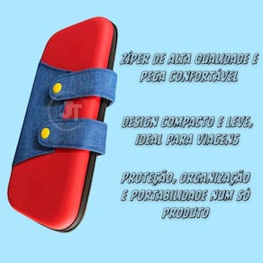 Capa rígida projetada para proteger o seu nintendo switch oled com estilo e segurança. Produzida em eva de alta resistência, é ideal para transporte e armazenamento, protegendo contra impactos, riscos e sujeira. O design moderno nas cores vermelho e azul dá um toque único ao seu acessório.