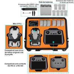 Case maleta rígida para drone dji mini 4 pro e acessórios Case maleta rígida para drone dji mini 4 pro e acessórios Sabemos que ter um drone requer um aparato de acessórios e que cada um deles exerce uma função imprescindível para um voo seguro e cheio de registros. Pensando nisso, nada melhor do que organizar o seu equipamento e todos os acessórios ou a maioria deles em um único lugar. Com esta maleta ou case da sunnylife especificamente feita para o drone dji mini 4 pro, os seus equipamentos estarão organizados e prontos para partir a qualquer instante Ela é super espaçosa e com uma grande capacidade de armazenar vários acessórios como: o drone, controle rc 2 ou rc-n2, hub de baterias, até 7 baterias incluindo uma no drone , hélices para reposição, cabos, carregadores, alças de segurança, caixas de filtro, trem de pouso e muito mais. Além da grande capacidade de armazenar o drone e seus acessórios, a case é à prova d&39;água, pois é bem fechada e selada, evitando efetivamente a infiltração ao entrar em contato com líquidos. Também possui alta resistência, é anti-queda, anti-compressão, resistente à corrosão e alta-baixa temperatura, pois é inteiramente feita de material rígido e super resistente a impactos, quedas e esmagamentos. Não é nada fácil danificar a case Internamente ela é feita com eva de alta qualidade para ser à prova de choque. E alça de borracha é macia, confortável, antiderrapante e resistente ao desgaste, e ainda alivia a pressão da mão. Principais vantagens: - feita especialmente para o drone dji mini 4 pro - armazena com segurança seus principais acessórios - totalmente fabricada com materiais de alta qualidade - resistente à água, corrosão, quedas, impactos e esmagamentos Dados técnicos: Marca: sunnylife Modelo: aqx-12 Cor: preto e laranja Material: plástico + eva Tamanho: 35,4 x 29,4 x 13,7cm Peso: 1,70kg Compatibilidade: Compatível com o drone dji mini 4 pro e seus acessórios Itens inclusos: 1x case maleta rígida para drone dji mini 4 pro e acessórios Drone e acessórios não inclusos Imagens meramente ilustrativas de 90 dias após o recebimento do produto Esta é válida para todo o território nacional, e ela cobre defeitos de fabricação. Para maiores informações consulte o site do fabricante ou contate-nos pelos nossos canais de atendimento. Por que comprar seu equipamento com a proaventura