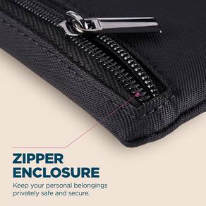 - Possui fechamento com zíper para guardar com segurança cartões, dinheiro, documentos, protetor labial e outros pequenos itens, mantendo-os organizados.